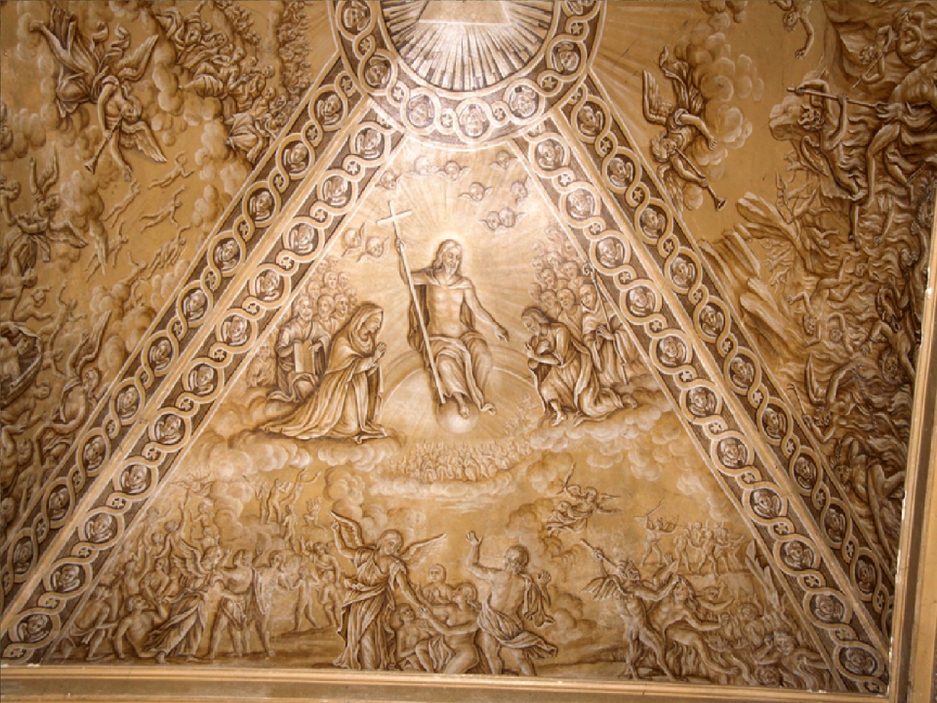 La Communion des Saints, avec Ste-Cécile en tête portant son instrument de musique.